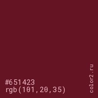 Цвет #651423 в цветовой модели RGB обозначается тремя октетами (101, 20, 35) в десятичном формате и #651423 в шестнадцатиричном (hex) формате, которые являются интенсивностью красного 101 (hex 65), интенсивность зелёного 20 (hex 14) и интенсивность синего 35 (hex 23).