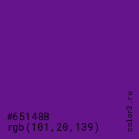 Цвет #65148B в цветовой модели RGB обозначается тремя октетами (101, 20, 139) в десятичном формате и #65148B в шестнадцатиричном (hex) формате, которые являются интенсивностью красного 101 (hex 65), интенсивность зелёного 20 (hex 14) и интенсивность синего 139 (hex 8B).