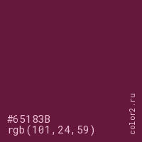 Цвет #65183B в цветовой модели RGB обозначается тремя октетами (101, 24, 59) в десятичном формате и #65183B в шестнадцатиричном (hex) формате, которые являются интенсивностью красного 101 (hex 65), интенсивность зелёного 24 (hex 18) и интенсивность синего 59 (hex 3B).