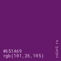 Цвет #651A69 в цветовой модели RGB обозначается тремя октетами (101, 26, 105) в десятичном формате и #651A69 в шестнадцатиричном (hex) формате, которые являются интенсивностью красного 101 (hex 65), интенсивность зелёного 26 (hex 1A) и интенсивность синего 105 (hex 69).