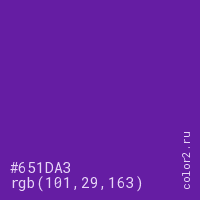 Цвет #651DA3 в цветовой модели RGB обозначается тремя октетами (101, 29, 163) в десятичном формате и #651DA3 в шестнадцатиричном (hex) формате, которые являются интенсивностью красного 101 (hex 65), интенсивность зелёного 29 (hex 1D) и интенсивность синего 163 (hex A3).