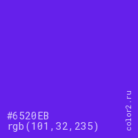 Цвет #6520EB в цветовой модели RGB обозначается тремя октетами (101, 32, 235) в десятичном формате и #6520EB в шестнадцатиричном (hex) формате, которые являются интенсивностью красного 101 (hex 65), интенсивность зелёного 32 (hex 20) и интенсивность синего 235 (hex EB).