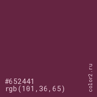 Цвет #652441 в цветовой модели RGB обозначается тремя октетами (101, 36, 65) в десятичном формате и #652441 в шестнадцатиричном (hex) формате, которые являются интенсивностью красного 101 (hex 65), интенсивность зелёного 36 (hex 24) и интенсивность синего 65 (hex 41).
