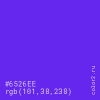 Цвет #6526EE в цветовой модели RGB обозначается тремя октетами (101, 38, 238) в десятичном формате и #6526EE в шестнадцатиричном (hex) формате, которые являются интенсивностью красного 101 (hex 65), интенсивность зелёного 38 (hex 26) и интенсивность синего 238 (hex EE).