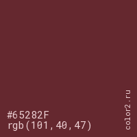Цвет #65282F в цветовой модели RGB обозначается тремя октетами (101, 40, 47) в десятичном формате и #65282F в шестнадцатиричном (hex) формате, которые являются интенсивностью красного 101 (hex 65), интенсивность зелёного 40 (hex 28) и интенсивность синего 47 (hex 2F).