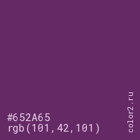 Цвет #652A65 в цветовой модели RGB обозначается тремя октетами (101, 42, 101) в десятичном формате и #652A65 в шестнадцатиричном (hex) формате, которые являются интенсивностью красного 101 (hex 65), интенсивность зелёного 42 (hex 2A) и интенсивность синего 101 (hex 65).