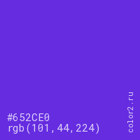 Цвет #652CE0 в цветовой модели RGB обозначается тремя октетами (101, 44, 224) в десятичном формате и #652CE0 в шестнадцатиричном (hex) формате, которые являются интенсивностью красного 101 (hex 65), интенсивность зелёного 44 (hex 2C) и интенсивность синего 224 (hex E0).