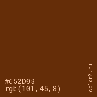 Цвет #652D08 в цветовой модели RGB обозначается тремя октетами (101, 45, 8) в десятичном формате и #652D08 в шестнадцатиричном (hex) формате, которые являются интенсивностью красного 101 (hex 65), интенсивность зелёного 45 (hex 2D) и интенсивность синего 8 (hex 08).