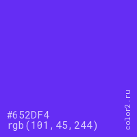 Цвет #652DF4 в цветовой модели RGB обозначается тремя октетами (101, 45, 244) в десятичном формате и #652DF4 в шестнадцатиричном (hex) формате, которые являются интенсивностью красного 101 (hex 65), интенсивность зелёного 45 (hex 2D) и интенсивность синего 244 (hex F4).