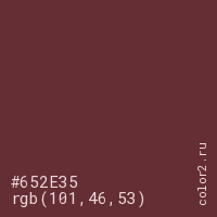 Цвет #652E35 в цветовой модели RGB обозначается тремя октетами (101, 46, 53) в десятичном формате и #652E35 в шестнадцатиричном (hex) формате, которые являются интенсивностью красного 101 (hex 65), интенсивность зелёного 46 (hex 2E) и интенсивность синего 53 (hex 35).