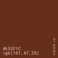 Цвет #652F1C в цветовой модели RGB обозначается тремя октетами (101, 47, 28) в десятичном формате и #652F1C в шестнадцатиричном (hex) формате, которые являются интенсивностью красного 101 (hex 65), интенсивность зелёного 47 (hex 2F) и интенсивность синего 28 (hex 1C).