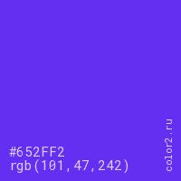 Цвет #652FF2 в цветовой модели RGB обозначается тремя октетами (101, 47, 242) в десятичном формате и #652FF2 в шестнадцатиричном (hex) формате, которые являются интенсивностью красного 101 (hex 65), интенсивность зелёного 47 (hex 2F) и интенсивность синего 242 (hex F2).