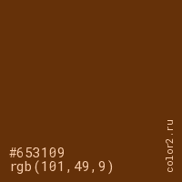 Цвет #653109 в цветовой модели RGB обозначается тремя октетами (101, 49, 9) в десятичном формате и #653109 в шестнадцатиричном (hex) формате, которые являются интенсивностью красного 101 (hex 65), интенсивность зелёного 49 (hex 31) и интенсивность синего 9 (hex 09).