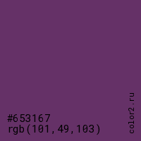 Цвет #653167 в цветовой модели RGB обозначается тремя октетами (101, 49, 103) в десятичном формате и #653167 в шестнадцатиричном (hex) формате, которые являются интенсивностью красного 101 (hex 65), интенсивность зелёного 49 (hex 31) и интенсивность синего 103 (hex 67).