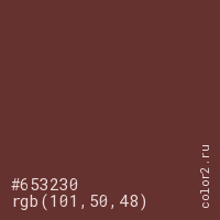 Цвет #653230 в цветовой модели RGB обозначается тремя октетами (101, 50, 48) в десятичном формате и #653230 в шестнадцатиричном (hex) формате, которые являются интенсивностью красного 101 (hex 65), интенсивность зелёного 50 (hex 32) и интенсивность синего 48 (hex 30).