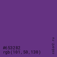 Цвет #653282 в цветовой модели RGB обозначается тремя октетами (101, 50, 130) в десятичном формате и #653282 в шестнадцатиричном (hex) формате, которые являются интенсивностью красного 101 (hex 65), интенсивность зелёного 50 (hex 32) и интенсивность синего 130 (hex 82).