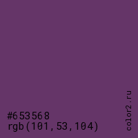 Цвет #653568 в цветовой модели RGB обозначается тремя октетами (101, 53, 104) в десятичном формате и #653568 в шестнадцатиричном (hex) формате, которые являются интенсивностью красного 101 (hex 65), интенсивность зелёного 53 (hex 35) и интенсивность синего 104 (hex 68).