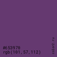 Цвет #653970 в цветовой модели RGB обозначается тремя октетами (101, 57, 112) в десятичном формате и #653970 в шестнадцатиричном (hex) формате, которые являются интенсивностью красного 101 (hex 65), интенсивность зелёного 57 (hex 39) и интенсивность синего 112 (hex 70).