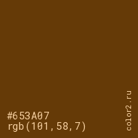 Цвет #653A07 в цветовой модели RGB обозначается тремя октетами (101, 58, 7) в десятичном формате и #653A07 в шестнадцатиричном (hex) формате, которые являются интенсивностью красного 101 (hex 65), интенсивность зелёного 58 (hex 3A) и интенсивность синего 7 (hex 07).