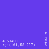 Цвет #653AED в цветовой модели RGB обозначается тремя октетами (101, 58, 237) в десятичном формате и #653AED в шестнадцатиричном (hex) формате, которые являются интенсивностью красного 101 (hex 65), интенсивность зелёного 58 (hex 3A) и интенсивность синего 237 (hex ED).