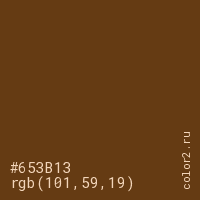 Цвет #653B13 в цветовой модели RGB обозначается тремя октетами (101, 59, 19) в десятичном формате и #653B13 в шестнадцатиричном (hex) формате, которые являются интенсивностью красного 101 (hex 65), интенсивность зелёного 59 (hex 3B) и интенсивность синего 19 (hex 13).