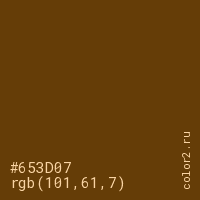 Цвет #653D07 в цветовой модели RGB обозначается тремя октетами (101, 61, 7) в десятичном формате и #653D07 в шестнадцатиричном (hex) формате, которые являются интенсивностью красного 101 (hex 65), интенсивность зелёного 61 (hex 3D) и интенсивность синего 7 (hex 07).
