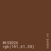 Цвет #653D26 в цветовой модели RGB обозначается тремя октетами (101, 61, 38) в десятичном формате и #653D26 в шестнадцатиричном (hex) формате, которые являются интенсивностью красного 101 (hex 65), интенсивность зелёного 61 (hex 3D) и интенсивность синего 38 (hex 26).