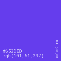 Цвет #653DED в цветовой модели RGB обозначается тремя октетами (101, 61, 237) в десятичном формате и #653DED в шестнадцатиричном (hex) формате, которые являются интенсивностью красного 101 (hex 65), интенсивность зелёного 61 (hex 3D) и интенсивность синего 237 (hex ED).