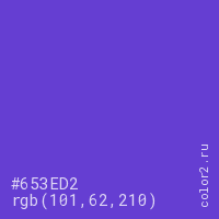 Цвет #653ED2 в цветовой модели RGB обозначается тремя октетами (101, 62, 210) в десятичном формате и #653ED2 в шестнадцатиричном (hex) формате, которые являются интенсивностью красного 101 (hex 65), интенсивность зелёного 62 (hex 3E) и интенсивность синего 210 (hex D2).