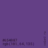 Цвет #654087 в цветовой модели RGB обозначается тремя октетами (101, 64, 135) в десятичном формате и #654087 в шестнадцатиричном (hex) формате, которые являются интенсивностью красного 101 (hex 65), интенсивность зелёного 64 (hex 40) и интенсивность синего 135 (hex 87).