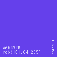 Цвет #6540EB в цветовой модели RGB обозначается тремя октетами (101, 64, 235) в десятичном формате и #6540EB в шестнадцатиричном (hex) формате, которые являются интенсивностью красного 101 (hex 65), интенсивность зелёного 64 (hex 40) и интенсивность синего 235 (hex EB).
