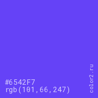 Цвет #6542F7 в цветовой модели RGB обозначается тремя октетами (101, 66, 247) в десятичном формате и #6542F7 в шестнадцатиричном (hex) формате, которые являются интенсивностью красного 101 (hex 65), интенсивность зелёного 66 (hex 42) и интенсивность синего 247 (hex F7).