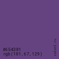 Цвет #654381 в цветовой модели RGB обозначается тремя октетами (101, 67, 129) в десятичном формате и #654381 в шестнадцатиричном (hex) формате, которые являются интенсивностью красного 101 (hex 65), интенсивность зелёного 67 (hex 43) и интенсивность синего 129 (hex 81).