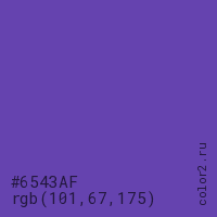 Цвет #6543AF в цветовой модели RGB обозначается тремя октетами (101, 67, 175) в десятичном формате и #6543AF в шестнадцатиричном (hex) формате, которые являются интенсивностью красного 101 (hex 65), интенсивность зелёного 67 (hex 43) и интенсивность синего 175 (hex AF).