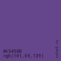 Цвет #65458B в цветовой модели RGB обозначается тремя октетами (101, 69, 139) в десятичном формате и #65458B в шестнадцатиричном (hex) формате, которые являются интенсивностью красного 101 (hex 65), интенсивность зелёного 69 (hex 45) и интенсивность синего 139 (hex 8B).