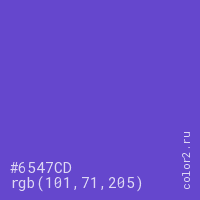 Цвет #6547CD в цветовой модели RGB обозначается тремя октетами (101, 71, 205) в десятичном формате и #6547CD в шестнадцатиричном (hex) формате, которые являются интенсивностью красного 101 (hex 65), интенсивность зелёного 71 (hex 47) и интенсивность синего 205 (hex CD).