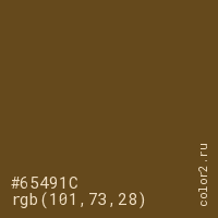 Цвет #65491C в цветовой модели RGB обозначается тремя октетами (101, 73, 28) в десятичном формате и #65491C в шестнадцатиричном (hex) формате, которые являются интенсивностью красного 101 (hex 65), интенсивность зелёного 73 (hex 49) и интенсивность синего 28 (hex 1C).
