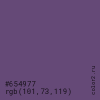 Цвет #654977 в цветовой модели RGB обозначается тремя октетами (101, 73, 119) в десятичном формате и #654977 в шестнадцатиричном (hex) формате, которые являются интенсивностью красного 101 (hex 65), интенсивность зелёного 73 (hex 49) и интенсивность синего 119 (hex 77).