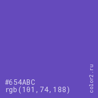Цвет #654ABC в цветовой модели RGB обозначается тремя октетами (101, 74, 188) в десятичном формате и #654ABC в шестнадцатиричном (hex) формате, которые являются интенсивностью красного 101 (hex 65), интенсивность зелёного 74 (hex 4A) и интенсивность синего 188 (hex BC).