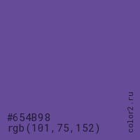 Цвет #654B98 в цветовой модели RGB обозначается тремя октетами (101, 75, 152) в десятичном формате и #654B98 в шестнадцатиричном (hex) формате, которые являются интенсивностью красного 101 (hex 65), интенсивность зелёного 75 (hex 4B) и интенсивность синего 152 (hex 98).