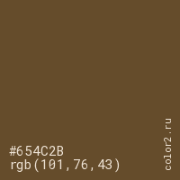 Цвет #654C2B в цветовой модели RGB обозначается тремя октетами (101, 76, 43) в десятичном формате и #654C2B в шестнадцатиричном (hex) формате, которые являются интенсивностью красного 101 (hex 65), интенсивность зелёного 76 (hex 4C) и интенсивность синего 43 (hex 2B).