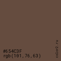 Цвет #654C3F в цветовой модели RGB обозначается тремя октетами (101, 76, 63) в десятичном формате и #654C3F в шестнадцатиричном (hex) формате, которые являются интенсивностью красного 101 (hex 65), интенсивность зелёного 76 (hex 4C) и интенсивность синего 63 (hex 3F).