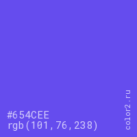 Цвет #654CEE в цветовой модели RGB обозначается тремя октетами (101, 76, 238) в десятичном формате и #654CEE в шестнадцатиричном (hex) формате, которые являются интенсивностью красного 101 (hex 65), интенсивность зелёного 76 (hex 4C) и интенсивность синего 238 (hex EE).