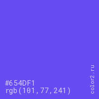 Цвет #654DF1 в цветовой модели RGB обозначается тремя октетами (101, 77, 241) в десятичном формате и #654DF1 в шестнадцатиричном (hex) формате, которые являются интенсивностью красного 101 (hex 65), интенсивность зелёного 77 (hex 4D) и интенсивность синего 241 (hex F1).