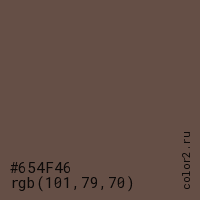 Цвет #654F46 в цветовой модели RGB обозначается тремя октетами (101, 79, 70) в десятичном формате и #654F46 в шестнадцатиричном (hex) формате, которые являются интенсивностью красного 101 (hex 65), интенсивность зелёного 79 (hex 4F) и интенсивность синего 70 (hex 46).
