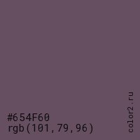 Цвет #654F60 в цветовой модели RGB обозначается тремя октетами (101, 79, 96) в десятичном формате и #654F60 в шестнадцатиричном (hex) формате, которые являются интенсивностью красного 101 (hex 65), интенсивность зелёного 79 (hex 4F) и интенсивность синего 96 (hex 60).