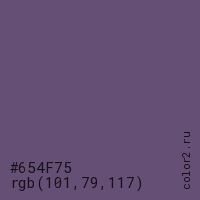 Цвет #654F75 в цветовой модели RGB обозначается тремя октетами (101, 79, 117) в десятичном формате и #654F75 в шестнадцатиричном (hex) формате, которые являются интенсивностью красного 101 (hex 65), интенсивность зелёного 79 (hex 4F) и интенсивность синего 117 (hex 75).
