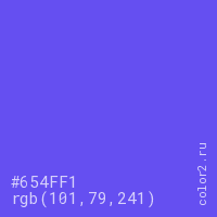 Цвет #654FF1 в цветовой модели RGB обозначается тремя октетами (101, 79, 241) в десятичном формате и #654FF1 в шестнадцатиричном (hex) формате, которые являются интенсивностью красного 101 (hex 65), интенсивность зелёного 79 (hex 4F) и интенсивность синего 241 (hex F1).