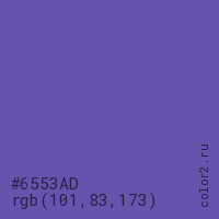 Цвет #6553AD в цветовой модели RGB обозначается тремя октетами (101, 83, 173) в десятичном формате и #6553AD в шестнадцатиричном (hex) формате, которые являются интенсивностью красного 101 (hex 65), интенсивность зелёного 83 (hex 53) и интенсивность синего 173 (hex AD).