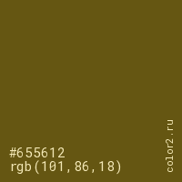 Цвет #655612 в цветовой модели RGB обозначается тремя октетами (101, 86, 18) в десятичном формате и #655612 в шестнадцатиричном (hex) формате, которые являются интенсивностью красного 101 (hex 65), интенсивность зелёного 86 (hex 56) и интенсивность синего 18 (hex 12).